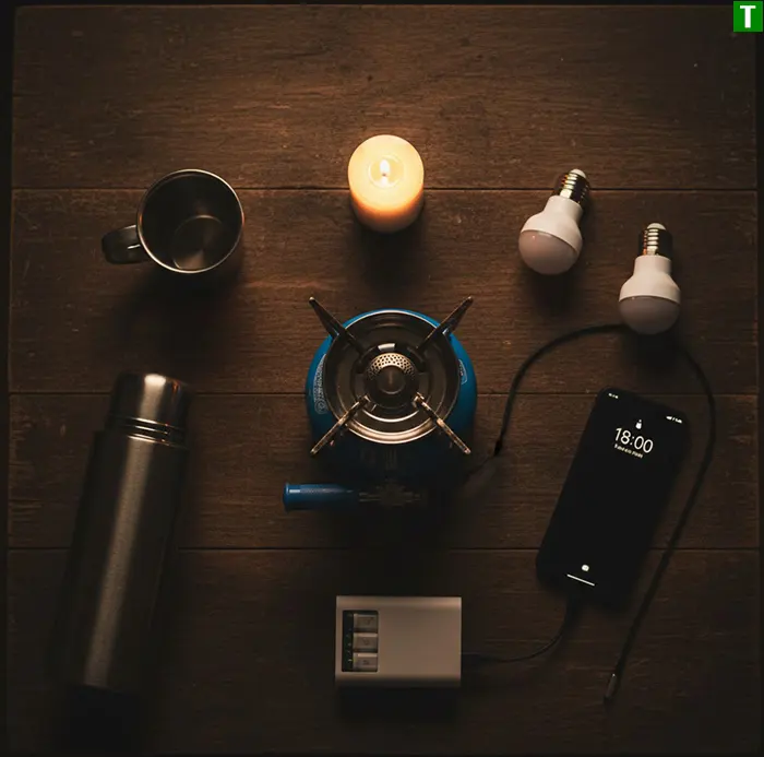 Ця система не вимагає зарядки від електромережі (примус працює на газі), забезпечує повноцінне освітлення (LED-лампи заряджаються автоматично коли є світло), підтримує інтернет протягом 6-7 годин (павербанк для роутера) і зберігає гарячі напої 12-16 годин (термос Stanley).